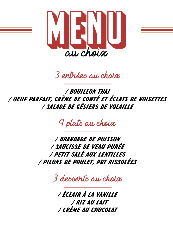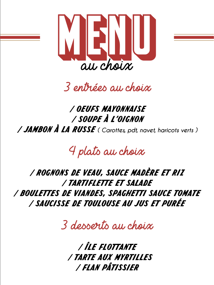 Oeufs mayo, soupe à l’oignon, brandade de morue, bœuf bourguignon, blanquette, profiterole, île flottante, riz au lait. Vous êtes prêt ?